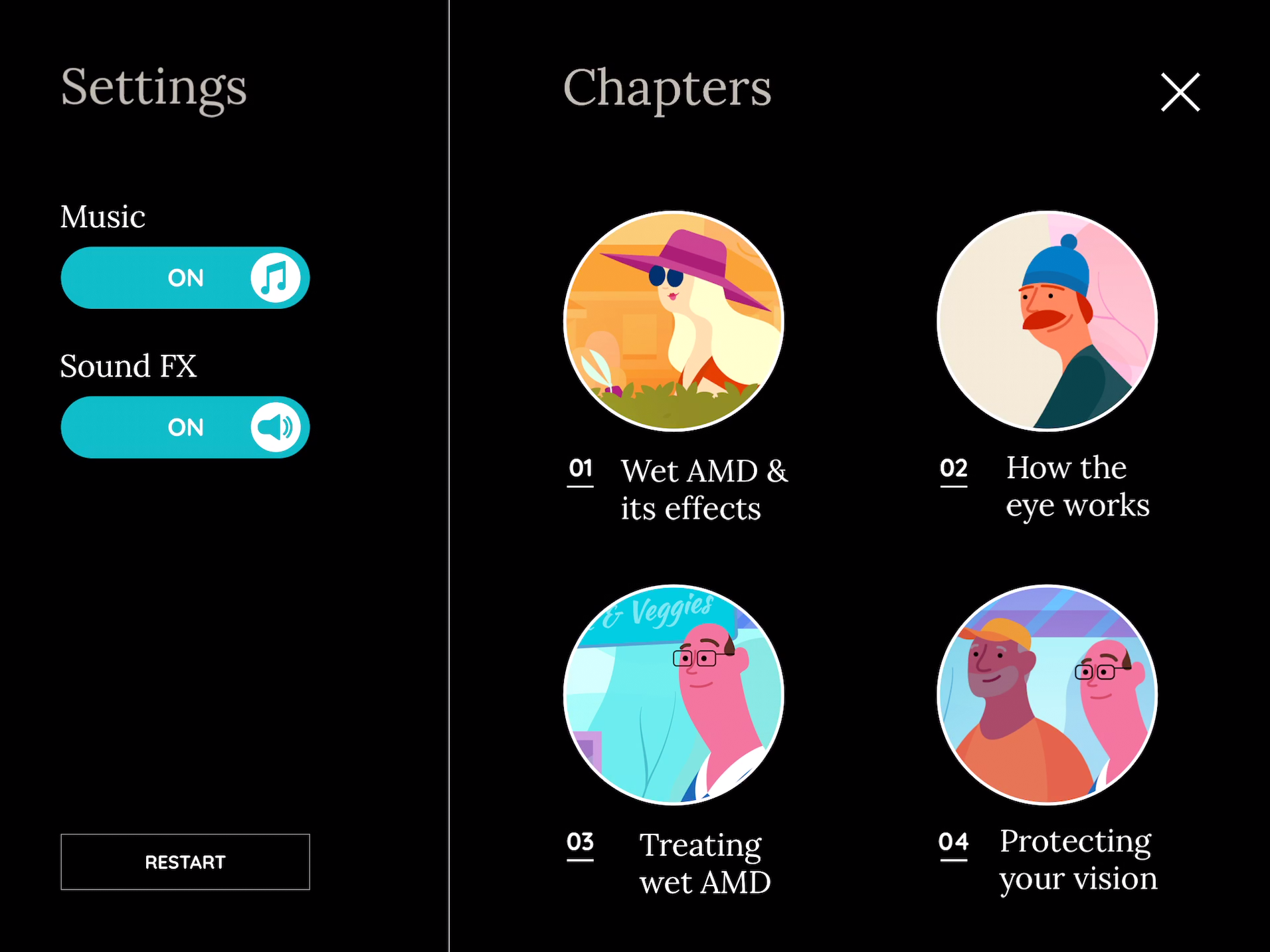 We were approached by McCann Sydney to work with them in developing an interactive tool to provide information to patients who have been diagnosed with Wet AMD and are undergoing treatment. The experience was tailored specifically for patients who would be waiting at a clinic to undergo treatment - and was designed to deliver important information about the condition and treatment.
